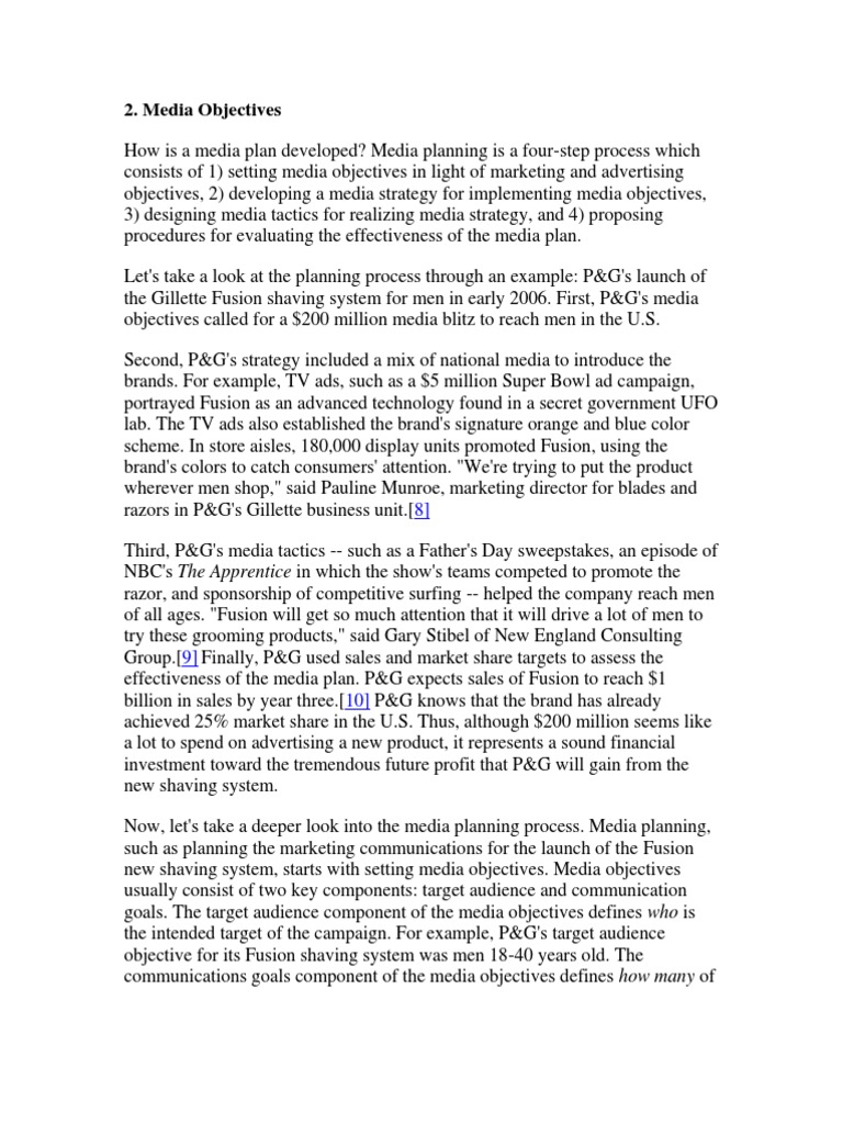 Media planning is a four-step process which consists of 1) setting media objectives in light of marketing and advertising objectives, 2) developing a media strategy for implementing media objectives, 3) designing media tactics for realizing media strategy, and 4) proposing procedures for evaluating the effectiveness of the media plan. Let's take a look at the planning process through an example: P&G's launch of the Gillette Fusion shaving system for men in early 2006. First, P&G's media objectives called for a $200 million media blitz to reach men in the U.S. Second, P&G's strategy included a mix of national media to introduce the brands. For example, TV ads, such as a $5 million Super Bowl ad campaign, portrayed Fusion as an advanced technology found in a secret government UFO lab. The TV ads also established the brand's signature orange and blue color scheme. In store aisles, 180,000 display units promoted Fusion, using the brand's colors to catch consumers' attention. "We're trying to put the product wherever men shop," said Pauline Munroe, marketing director for blades and razors in P&G's Gillette business unit.[8] Third, P&G's media tactics -- such as a Father's Day sweepstakes, an episode of NBC's The Apprentice in which the show's teams competed to promote the razor, and sponsorship of competitive surfing -- helped the company reach men of all ages. "Fusion will get so much attention that it will drive a lot of men to try these grooming products," said Gary Stibel of New England Consulting Group.[9] Finally, P&G used sales and market share targets to assess the effectiveness of the media plan. P&G expects sales of Fusion to reach $1 billion in sales by year three.[10] P&G knows that the brand has already achieved 25% market share in the U.S. Thus, although $200 million seems like a lot to spend on advertising a new product, it represents a sound financial investment toward the tremendous future profit that P&G will gain from the new shaving system. Now, let's take a deeper look into the media planning process. Media planning, such as planning the marketing communications for the launch of the Fusion new shaving system, starts with setting media objectives. Media objectives usually consist of two key components: target audience and communication goals. The target audience component of the media objectives defines who is the intended target of the campaign. For example, P&G's target audience objective for its Fusion shaving system was men 18-40 years old. The communications goals component of the media objectives defines how many of