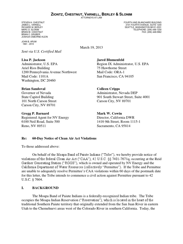 CAA violations within 60 days of the postmark date for this letter, the Tribe intends to commence a civil action against Permittee pursuant to 42 U.S.C. § 7604.