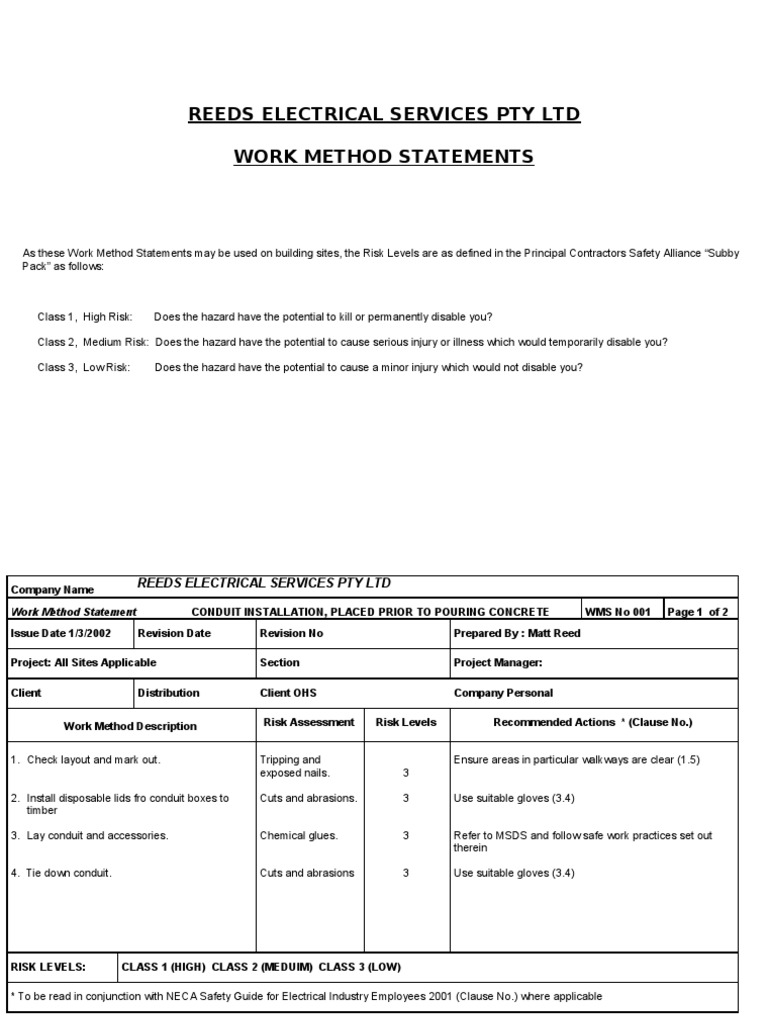 REEDS ELECTRICAL SERVICES PTY LTD WORK METHOD STATEMENTS