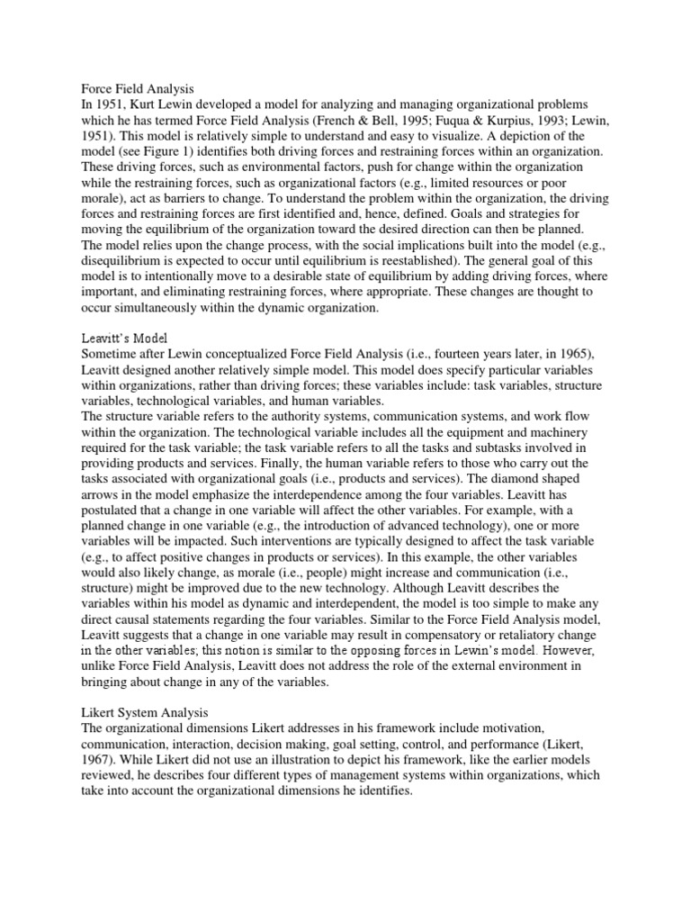 he has termed Force Field Analysis (French & Bell, 1995; Fuqua & Kurpius, 1993; Lewin, 1951). This model is relatively simple to understand and easy to visualize. A depiction of the model (see Figure 1) identifies both driving forces and restraining forces within an organization. These driving forces, such as environmental factors, push for change within the organization while the restraining forces, such as organizational factors (e.g., limited resources or poor morale), act as barriers to change. To understand the problem within the organization, the driving forces and restraining forces are first identified and, hence, defined. Goals and strategies for moving the equilibrium of the organization toward the desired direction can then be planned. The model relies upon the change process, with the social implications built into the model (e.g., disequilibrium is expected to occur until equilibrium is reestablished). The general goal of this model is to intentionally move to a desirable state of equilibrium by adding driving forces, where important, and eliminating restraining forces, where appropriate. These changes are thought to occur simultaneously within the dynamic organization. Leavitts Model Sometime after Lewin conceptualized Force Field Analysis (i.e., fourteen years later, in 1965), Leavitt designed another relatively simple model. This model does specify particular variables within organizations, rather than driving forces; these variables include: task variables, structure variables, technological variables, and human variables. The structure variable refers to the authority systems, communication systems, and work flow within the organization. The technological variable includes all the equipment and machinery required for the task variable; the task variable refers to all the tasks and subtasks involved in providing products and services. Finally, the human variable refers to those who carry out the tasks associated with organizational goals (i.e., products and services). The diamond shaped arrows in the model emphasize the interdependence among the four variables. Leavitt has postulated that a change in one variable will affect the other variables. For example, with a planned change in one variable (e.g., the introduction of advanced technology), one or more variables will be impacted. Such interventions are typically designed to affect the task variable (e.g., to affect positive changes in products or services). In this example, the other variables would also likely change, as morale (i.e., people) might increase and communication (i.e., structure) might be improved due to the new technology. Although Leavitt describes the variables within his model as dynamic and interdependent, the model is too simple to make any direct causal statements regarding the four variables. Similar to the Force Field Analysis model, Leavitt suggests that a change in one variable may result in compensatory or retaliatory change in the other variables; this notion is similar to the opposing forces in Lewins model. However, unlike Force Field Analysis, Leavitt does not address the role of the external environment in bringing about change in any of the variables. Likert System Analysis The organizational dimensions Likert addresses in his framework include motivation, communication, interaction, decision making, goal setting, control, and performance (Likert, 1967). While Likert did not use an illustration to depict his framework, like the earlier models reviewed, he describes four different types of management systems within organizations, which take into account the organizational dimensions he identifies.