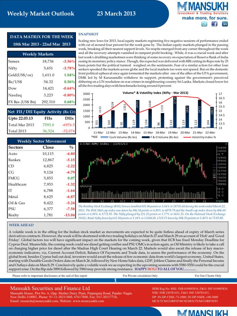 A volatile week is in the offing for the Indian stock market as movements are expected to be quite listless ahead of expiry of March series derivatives contracts. However, the week will be shortened with two trading holidays on March 27 and March 29 on account of 'Holi' and 'Good Friday'. Global factors too will have significant impact on the markets for the coming week, given that ECB has fixed Monday Deadline for Cyprus Deal. Meanwhile, the coming week could see diesel getting costlier and PSU OMCs in action again, as Oil Ministry is likely to take a call on charging higher price for diesel after the Madras High Court Hearing on March 22. Markets would also await the release of key macroeconomic indicators, viz, Current Account Deficit, Balance Of Payments and Trade data, to assess the performance of the economy. On the global front, besides Cyprus bail out deal, investors would await the release of few economic data from world's largest economy, United States, starting with Durable Goods Orders data on March 26, followed by New Home Sales data, GDP, Jobless Claims and finally the Personal Income and Outlays data on March 29. Conclusively quite a volatile week we ae expecting in the upcoming sessions with 5580-5550 could be the crucial support zone. On the flip side 5890 followed by 5960 may provide strong resistance. HAPPY HOLI TO ALL OF YOU...............