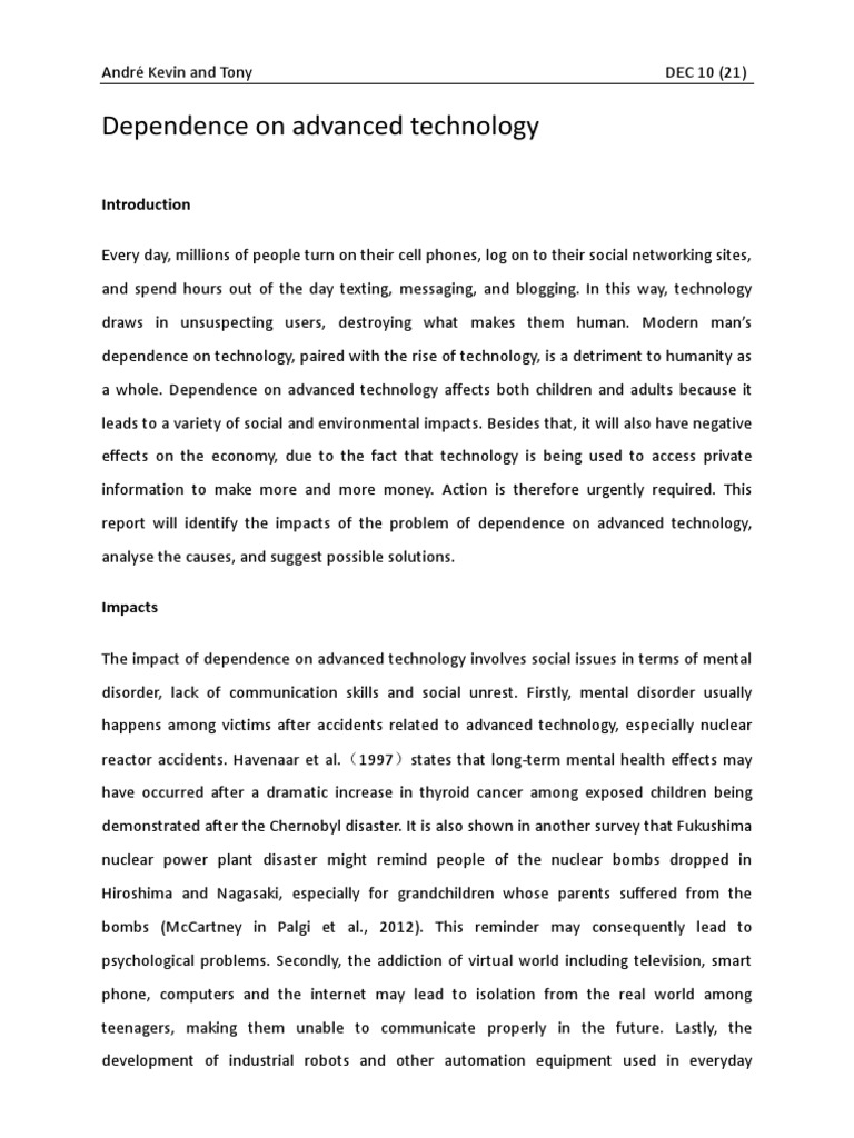Introduction Every day, millions of people turn on their cell phones, log on to their social networking sites, and spend hours out of the day texting, messaging, and blogging. In this way, technology draws in unsuspecting users, destroying what makes them human. Modern mans dependence on technology, paired with the rise of technology, is a detriment to humanity as a whole. Dependence on advanced technology affects both children and adults because it leads to a variety of social and environmental impacts. Besides that, it will also have negative effects on the economy, due to the fact that technology is being used to access private information to make more and more money. Action is therefore urgently required. This report will identify the impacts of the problem of dependence on advanced technology, analyse the causes, and suggest possible solutions. Impacts The impact of dependence on advanced technology involves social issues in terms of mental disorder, lack of communication skills and social unrest. Firstly, mental disorder usually happens among victims after accidents related to advanced technology, especially nuclear reactor accidents. Havenaar et al.1997states that long-term mental health effects may have occurred after a dramatic increase in thyroid cancer among exposed children being demonstrated after the Chernobyl disaster. It is also shown in another survey that Fukushima nuclear power plant disaster might remind people of the nuclear bombs dropped in Hiroshima and Nagasaki, especially for grandchildren whose parents suffered from the bombs (McCartney in Palgi et al., 2012). This reminder may consequently lead to psychological problems. Secondly, the addiction of virtual world including television, smart phone, computers and the internet may lead to isolation from the real world among teenagers, making them unable to communicate properly in the future. Lastly, the development of industrial robots and other automation equipment used in everyday