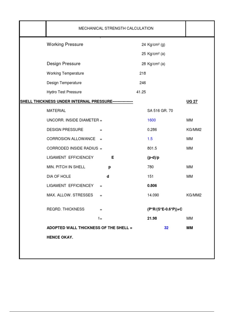 Working Temperature Design Temperature Hydro Test Pressure SHELL THICKNESS UNDER INTERNAL PRESSURE---------------MATERIAL UNCORR. INSIDE DIAMETER = D DESIGN PRESSURE CORROSION ALLOWANCE P = =C