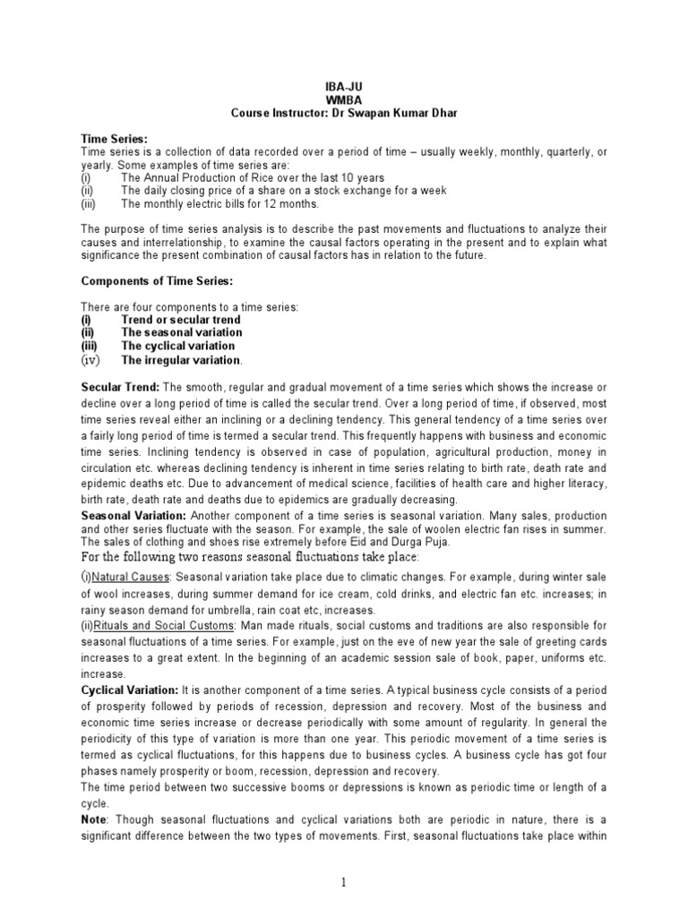 IBA-JU WMBA Course Instructor: Dr Swapan Kumar Dhar Time Series: Time series is a collection of data recorded over