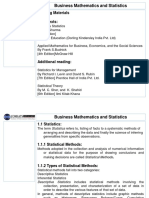 Definition of Statistics Statistics is the science of collecting, organizing, presenting, analyzing and interpreting data for the purpose of making intelligent statements and drawing appropriate conclusions. So, according to this definition, there are four stages: (1) Collection of data (2) Presentation of data (3) Analysis of data and (4) Interpretation of data. Example of Statistics: Examples include the average starting salary of college graduates, the number of deaths due to road accidents last year, and 20% students of BBA are female. In these examples statistics are a value or a percentage. Other examples include: 95% students of BBA come to the class in time. 25% students of IBA come to the campus by car. The above are all examples of statistics. Data: Data are the facts and figures that are collected, analyzed and summarized for presentation and interpretation. The data collected in a particular study are referred as the data set for the study. For example, the heights (in cm.) of 14 randomly selected persons from a group of 100 persons are as follows: 152, 160, 158, 155, 154, 155, 162, 164, 160, 153, 161, 158, 167, 151. The above information on height of people constitutes a data. A set of five students is selected from a class of the course Business Statistics and measurements are entered into a spreadsheet as shown in the following Figure. Figure: Measurements on five undergraduate students: