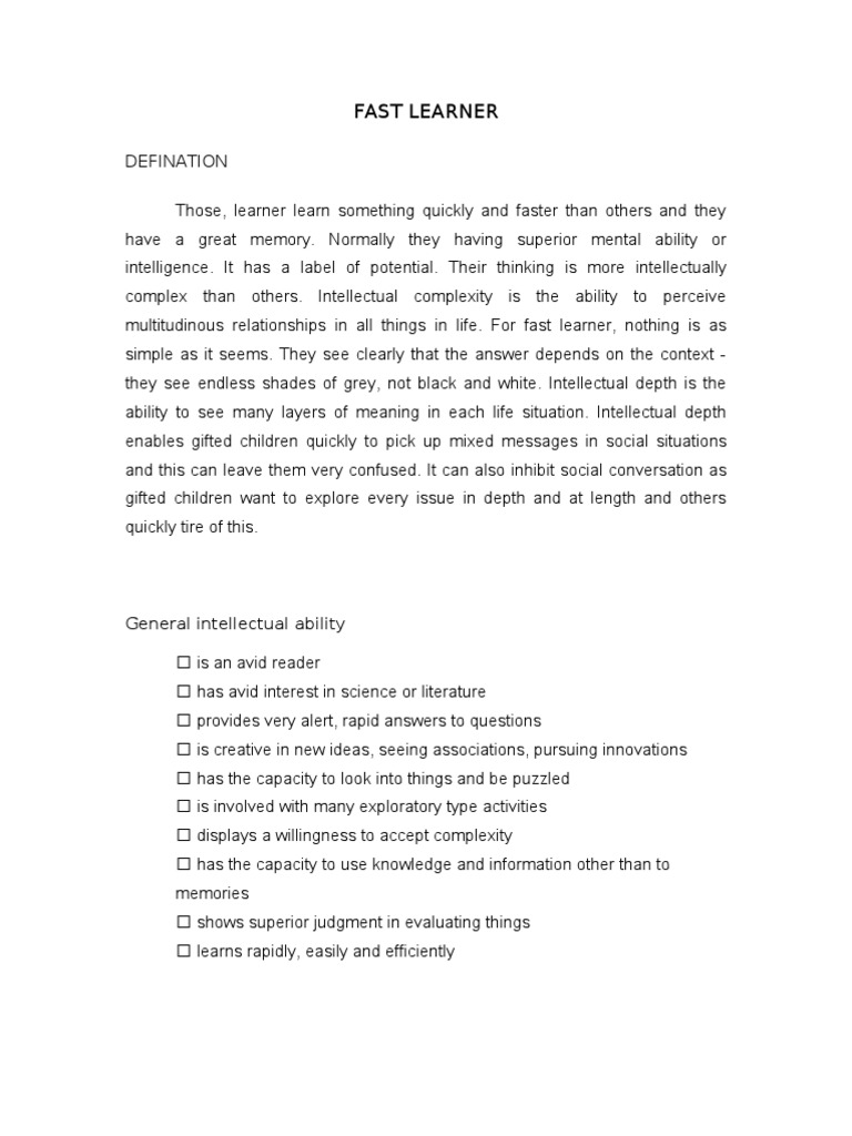 DEFINATION Those, learner learn something quickly and faster than others and they have a great memory. Normally they having superior mental ability or intelligence. It has a label of potential. Their thinking is more intellectually complex than others. Intellectual complexity is the ability to perceive multitudinous relationships in all things in life. For fast learner, nothing is as simple as it seems. They see clearly that the answer depends on the context they see endless shades of grey, not black and white. Intellectual depth is the ability to see many layers of meaning in each life situation. Intellectual depth enables gifted children quickly to pick up mixed messages in social situations and this can leave them very confused. It can also inhibit social conversation as gifted children want to explore every issue in depth and at length and others quickly tire of this.