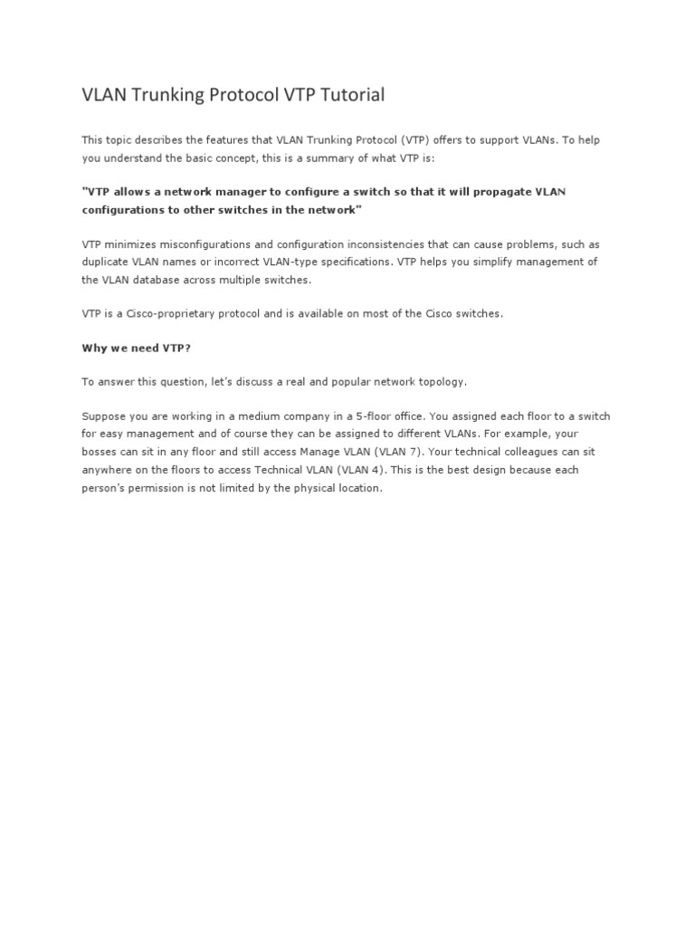 This topic describes the features that VLAN Trunking Protocol (VTP) offers to support VLANs. To help you understand the basic concept, this is a summary of what VTP is: VTP allows a network manager to configure a switch so that it will propagate VLAN configurations to other switches in the network VTP minimizes misconfigurations and configuration inconsistencies that can cause problems, such as duplicate VLAN names or incorrect VLAN-type specifications. VTP helps you simplify management of the VLAN database across multiple switches. VTP is a Cisco-proprietary protocol and is available on most of the Cisco switches. Why we need VTP? To answer this question, lets discuss a real and popular network topology. Suppose you are working in a medium company in a 5-floor office. You assigned each floor to a switch for easy management and of course they can be assigned to different VLANs. For example, your bosses can sit in any floor and still access Manage VLAN (VLAN 7). Your technical colleagues can sit anywhere on the floors to access Technical VLAN (VLAN 4). This is the best design because each persons permission is not limited by the physical location.