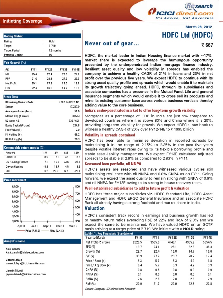 HDFCs consistent track record in earnings and business growth has led to healthy return ratios averaging RoE of 22% and RoA of 2.8% and we expect the same to be maintained. We have valued HDFC on an SOTP basis arriving at a target price of | 719. We initiate with a HOLD rating.