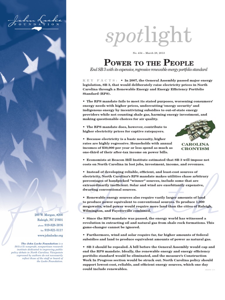 Conclusion and recommendations SB 3 was passed in 2007 under justifications that the bills mandate cant achieve. Using state policy to force an arbitrary percentage of electricity generation from unreliable, expensive sources cannot reliably meet consumers energy needs. Whatever energy security is, it isnt helped by promoting only some kinds of indigenous energy resources and subsidizing renewable energy providers outside the state. Encouraging private investment in renewable energy and energy efficiency is of little consequence when the net effect is an overall loss of private investment and more expensive energy. Finally, if improving air quality were that important, the mandates would not exclude nuclear and natural gas while allowing the burning of wood and animal waste, and major renewable sources that need backup generation may, because of the necessary frequent cycling of balancing coal plants, actually lead to diminished air quality. As in North Carolina under SB 3, renewable portfolio standards in other states are raising electricity rates on residences and causing losses in jobs, investment, incomes, and state GDPs. At present, renewable energy sources require far more subsidies to yield the same amount of energy as conventional sources. Renewable energy plants also need much more land to generate the same amount of energy as conventional sources. Supporters of North Carolinas renewables mandate argue now that it leads to the creation (or retention) of jobs in renewable energy, though again that doesnt account for this green cronyism being bought by higher rates on captive ratepayers. SB 3 also makes ratepayers support businesses that decide to purchase subsidized energy-efficient goods and services, as well as utilities that wish to construct nuclear power plants without any risk to shareholders. These costs affect the poorest ratepayers the most; households with incomes of $30,000 or less spend one-tenth to as much as one-third of their after-tax income on electricity. All of this occurs in a tightly restricted market where consumers are allowed no choice over their electricity providers. For these reasons, SB 3 should be repealed. At the very least, as is currently under discussion, the renewable energy portfolio standard should be capped and ended. Ideally, the renewable energy and energy efficiency portfolio standard would be eliminated, and CWIP would be struck out. North Carolina policy should support lowest-cost, reliable, and efficient energy sources. One day those could include renewable sources, but it should be left to private entrepreneurs competing and seeking innovation to bring that about. Meanwhile, rather than dictate energy source bundles to utilities, N.C. lawmakers should consider ways to free up electricity markets to less price-sensitive consumers who would like to be able to receive electricity from select sources, including solar and wind power, if given the opportunity.