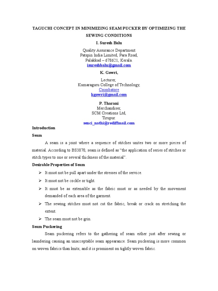 the Taguchi method to minimize the seam pucker problem. To verify the procedure, by