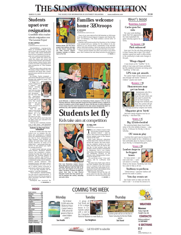 "It's a classic 'tempest in a teapot,'" says school attorney John Moyer. "We lost a fantastic teacher over a silly issue," says a senior student. 320 troops from the 69th forward support company arrive at fort sill. The troops are part of the 17th Field Artillery battalion.