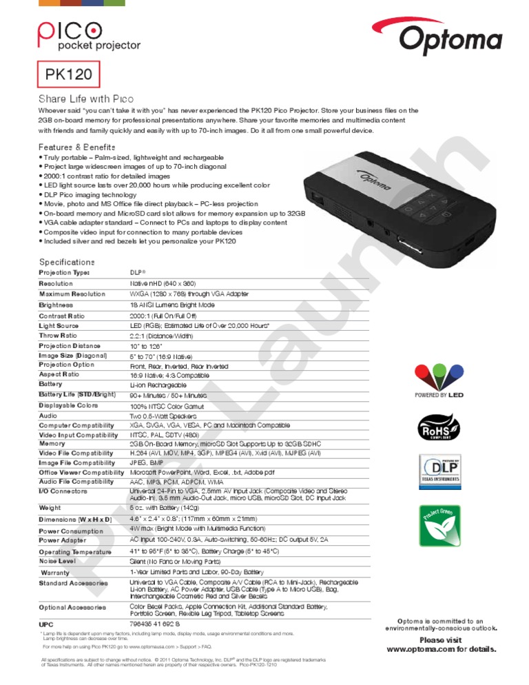 * Lamp life is dependent upon many factors, including lamp mode, display mode, usage environmental conditions and more. Lamp brightness can decrease over time. For more help on using Pico PK120 go to [Link] > Support > FAQ. All specifications are subject to change without notice. 2011 Optoma Technology, Inc. DLP and the DLP logo are registered trademarks of Texas Instruments. All other names mentioned herein are property of their respective owners. Pico-PK120-1210