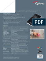 100% NTSC Color Gamut Two 0.5-Watt Speakers XGA, SVGA, VGA, VESA, PC and Macintosh Compatible NTSC, PAL, SDTV (480i) 2GB On-Board Memory, microSD Slot Supports Up to 32GB SDHC H.264 (AVI, MOV, MP4, 3GP), MPEG4 (AVI), Xvid (AVI), MJPEG (AVI) JPEG, BMP Microsoft PowerPoint, Word, Excel, .txt, Adobe pdf AAC, MP3, PCM, ADPCM, WMA Universal 24-Pin to VGA, 2.5mm AV Input Jack (Composite Video and Stereo Audio-In), 3.5 mm Audio-Out Jack, micro USB, microSD Slot, DC Input Jack 5 oz. with Battery (142g) 4.6 x 2.4 x 0.8; (117mm x 60mm x 21mm) 4W max (Bright Mode with Multimedia Function) AC Input 100-240V, 0.3A, Auto-switching, 50-60Hz; DC output 5V, 2A 41 to 95F (5 to 35C), Battery Charge (5 to 45C) Silent (No Fans or Moving Parts) 1-Year Limited Parts and Labor, 90-Day Battery Universal to VGA Cable, Composite A/V Cable (RCA to Mini-Jack), Rechargeable Li-ion Battery, AC Power Adapter, USB Cable (Type A to Micro USB), Bag, Interchangeable Cosmetic Red and Silver Bezels Color Bezel Packs, Apple Connection Kit, Additional Standard Battery, Portfolio Screen, Flexible Leg Tripod, Tabletop Screens 796435 41 692 8 Optoma is committed to an environmentally-conscious outlook.