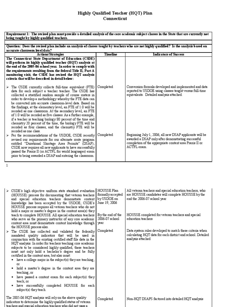 a HQT plan template to assist the districts in addressing their