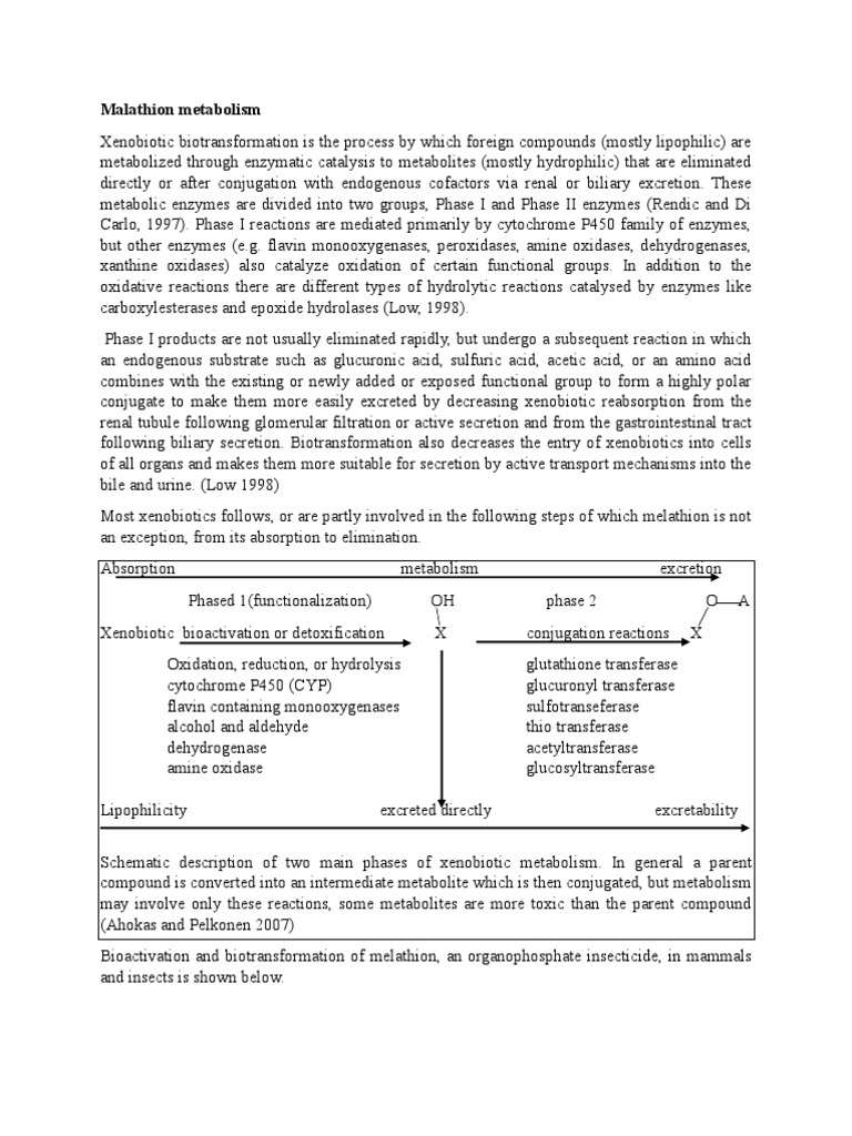 Schematic description of two main phases of xenobiotic metabolism. In general a parent compound is converted into an intermediate metabolite which is then conjugated, but metabolism may involve only these reactions, some metabolites are more toxic than the parent compound (Ahokas and Pelkonen 2007) Bioactivation and biotransformation of melathion, an organophosphate insecticide, in mammals and insects is shown below.