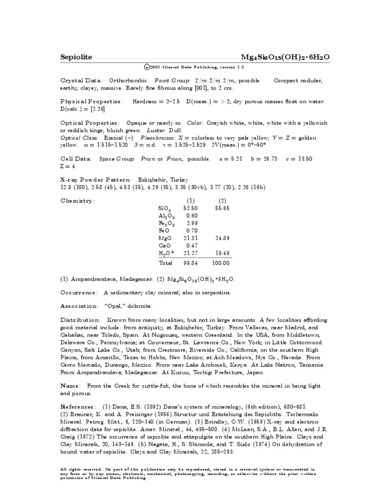 Distribution: Known from many localities, but not in large amounts. A few localities aording good material include: from antiquity, at Eski shehir, Turkey. From Vallecas, near Madrid, and Caba~ nas, near Toledo, Spain. At Nugssuaq, western Greenland. In the USA, from Middletown, Delaware Co., Pennsylvania; at Gouverneur, St. Lawrence Co., New York; in Little Cottonwood Canyon, Salt Lake Co., Utah; from Crestmore, Riverside Co., California; on the southern High Plains, from Amarillo, Texas to Hobbs, New Mexico; at Ash Meadows, Nye Co., Nevada. From Cerro Mercado, Durango, Mexico. From near Lake Amboseli, Kenya. At Lake Natron, Tanzania. From Ampandrandava, Madagascar. At Kuzuu, Tochigi Prefecture, Japan. Name: From the Greek for cuttle-sh , the bone of which resembles the mineral in being light and porous. References: (1) Dana, E.S. (1892) Dana's system of mineralogy, (6th edition), 680{681. (2) Brauner, K. and A. Preisinger (1956) Structur und Entstehung des Sepioliths. Tschermaks Mineral. Petrog. Mitt., 6, 120{140 (in German). (3) Brindley, G.W. (1959) X-ray and electron diraction data for sepiolite. Amer. Mineral., 44, 495{500. (4) McLean, S.A., B.L. Allen, and J.R. Craig (1972) The occurrence of sepiolite and attapulgite on the southern High Plains. Clays and Clay Minerals, 20, 143{149. (5) Nagata, H., S. Shimoda, and T. Sudo (1974) On dehydration of bound water of sepiolite. Clays and Clay Minerals, 22, 285{293.