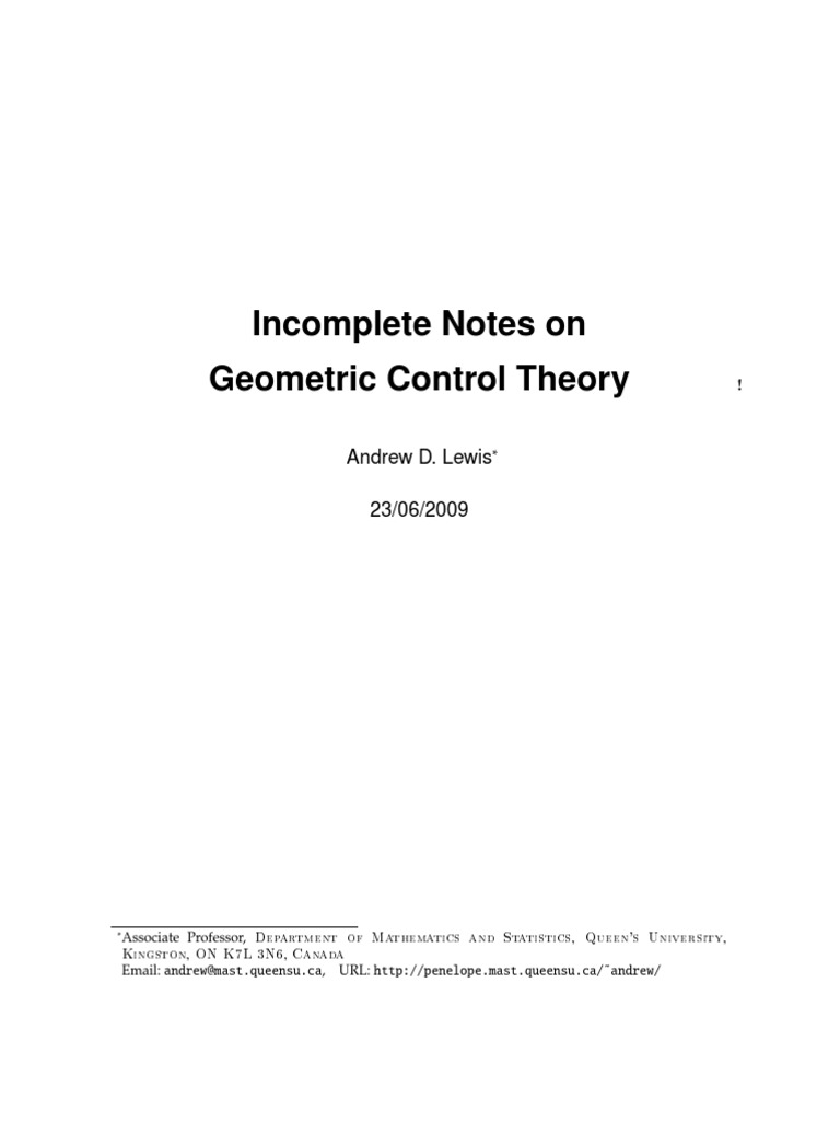 On introduction to matters of computation and computational complexity can be found in the book [Sipser 1996]. ! Control theory It is important not to forget that geometric control theory is about control theory as well as dierential geometry. It is assumed that the reader is familiar with basic topics in control theory, as such familiarity forms an essential context within which to understand geometric control theory. Without appreciating the needs of control theory, it is possible to turn geometric control theory into a rather unhappy distortion of what it is supposed to be. When thinking about problems in geometric control theory, one should always ask, What is the problem in control theory that this is contributing to? Of course, control theory is an enormous subject with many specialities, and geometric control theory is only even slightly related to a small subset of these specialities, e.g., continuous-time, nite-dimensional systems described by dierential equation models. And even within this small subset, one does not need to understand everything to be able to properly contextualise geometric control theory. For example, one need not understand the latest in robust adaptive controller design schemes to do useful research in geometric control theory. However, perhaps as a bare minimum, one should have familiarity with the following areas. 1. Linear control theory: The basics of linear control theory are well-established, and so form as excellent starting point for studying control theory. The fundamental problems are all precisely formulated and, in some sense at least, solved. There are many linear systems texts available, most of which are intended for graduate students in engineering. Many of these are presented with sucient rigour to be useful preparation for geometric control theory. One book that stands out from the norm in its treatment is that of Wonham [1985]. This book provides a very good formulation of linear control theory for the purposes of studying geometric control theory, and so might be a good starting point for someone coming from a background where control theory is absent. 2. Some of nonlinear control theory: The subject known as nonlinear control theory is quite expansive. Some areas of nonlinear control theory clearly overlap with geometric control theory. However, there is a signicant body of nonlinear control theory that really has no overlap with geometric control theory, and is more of a nonlinearisation of linear control theory. This latter sort of nonlinear control theory is presented in the text [Khalil 1996]. It is useful to understand some of this sort of nonlinear control theory. In particular, some of the more analytical techniques from this area are useful to know. However, the tools are decidedly not geometric, and at some point one has to really shake free from this sort of nonlinear control theory in order to immerse oneself into geometric control theory. A more geometric presentation of nonlinear control theory can be found in the books of Isidori [1995] and Nijmeijer and van der Schaft [1990]. The later volume,