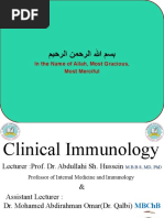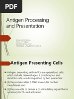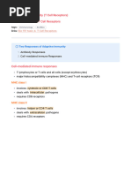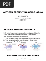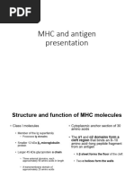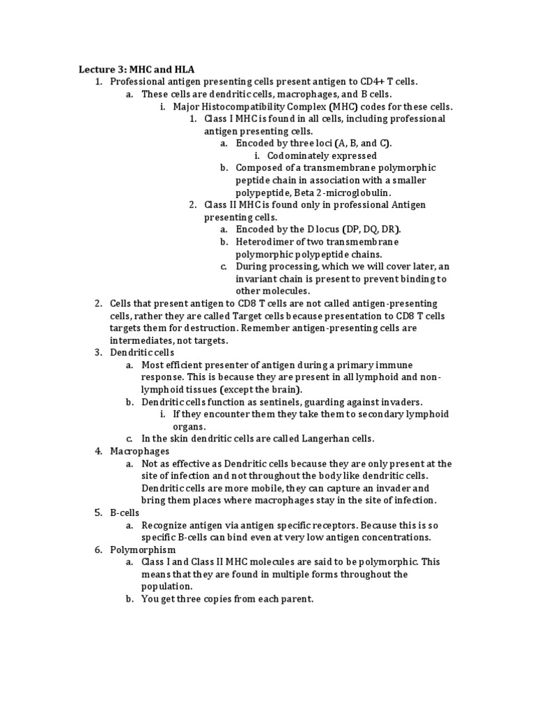 These cells are dendritic cells, macrophages, and B cells. i. Major Histocompatibility Complex (MHC) codes for these cells. 1. Class I MHC is found in all cells, including professional antigen presenting cells. a. Encoded by three loci (A, B, and C). i. Codominately expressed b. Composed of a transmembrane polymorphic peptide chain in association with a smaller polypeptide, Beta 2-microglobulin. 2. Class II MHC is found only in professional Antigen presenting cells. a. Encoded by the D locus (DP, DQ, DR). b. Heterodimer of two transmembrane polymorphic polypeptide chains. c. During processing, which we will cover later, an invariant chain is present to prevent binding to other molecules. 2. Cells that present antigen to CD8 T cells are not called antigen-presenting cells, rather they are called Target cells because presentation to CD8 T cells targets them for destruction. Remember antigen-presenting cells are intermediates, not targets. 3. Dendritic cells a. Most efficient presenter of antigen during a primary immune response. This is because they are present in all lymphoid and nonlymphoid tissues (except the brain). b. Dendritic cells function as sentinels, guarding against invaders. i. If they encounter them they take them to secondary lymphoid organs. c. In the skin dendritic cells are called Langerhan cells. 4. Macrophages a. Not as effective as Dendritic cells because they are only present at the site of infection and not throughout the body like dendritic cells. Dendritic cells are more mobile, they can capture an invader and bring them places where macrophages stay in the site of infection. 5. B-cells a. Recognize antigen via antigen specific receptors. Because this is so specific B-cells can bind even at very low antigen concentrations. 6. Polymorphism a. Class I and Class II MHC molecules are said to be polymorphic. This means that they are found in multiple forms throughout the population. b. You get three copies from each parent.