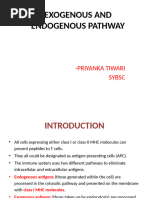i. This is advantageous because otherwise there may be a whole in our protection and a antigen would form that we could not defend against. 7. Class II MHC restriction a. Class II MHC molecules can only present to CD4+ T cells and CD4+ T cells can only see antigen presented by Class II MHC molecules. b. Class I MHC restriction is the same concept. Class I MHC cells present only to CD8 T cells and CD8 T cells can only see antigen through Class I MHC cells. 8. Exogenous Antigen processing and presentation by Class II MHC a. An antigen is present extracellularly, its brought in via endocytosis. b. Endosome fuses with a lysosome that releases its contents inside. i. The contents dissolve the antigen c. Another vesicle fuses with the endolysosome that contains Class II MHC receptors. The acidic environment dissolves the invariant chain allowing the receptors to take up the antigen fragments. i. Remember the invariant chain was covering the Class II MHC receptor site preventing it from binding to other molecules. d. These receptors are then taken to the cell surface . 9. Endogenous Antigen processing and presentation by Class I MHC a. Antigen is present in the cytoplasm of the cell. b. Ubiquitin attaches to the antigen targeting it for destruction. c. The proteasome degrades the antigen to peptides. d. TAP (Transporter of Antigen Processing) picks up the peptides and transports them to the endoplasmic reticulum. e. The peptide fragments join the Class I MHC molecules and are released to fuse with the cell membrane. 10. Cross Presentation a. In some cases exogenous antigen is presented to Class I MHC molecules. b. Some hypothesize that this could be because molecules escape from the endosome. 11. Some molecules are able to escape this processing. a. Herpes Simplex Virus (HHV-1,2) i. Inhibits TAP, therefore Class I MHC complexes do not form and care not presented on the cell surface. b. Epstein Barr Virus (HHV-4) i. Inhibits the activity of proteasomes preventing the hydrolysis of viral proteins into peptide size fragments. In this way the TAP cannot pick them up due to their size. c. Cytomegalovirus (HHV-5) i. Hinders the expression of Class I MHC by directing the vesicles containing the receptor/antigen into the cytoplasm where it is degraded.
