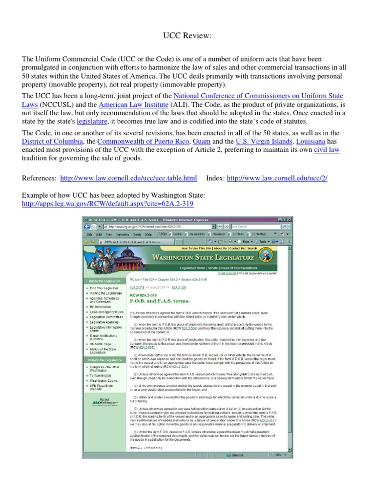 The Uniform Commercial Code (UCC or the Code) is one of a number of uniform acts that have been promulgated in conjunction with efforts to harmonize the law of sales and other commercial transactions in all 50 states within the United States of America. The UCC deals primarily with transactions involving personal property (movable property), not real property (immovable property). The UCC has been a long-term, joint project of the National Conference of Commissioners on Uniform State Laws (NCCUSL) and the American Law Institute (ALI). The Code, as the product of private organizations, is not itself the law, but only recommendation of the laws that should be adopted in the states. Once enacted in a state by the state's legislature, it becomes true law and is codified into the states code of statutes. The Code, in one or another of its several revisions, has been enacted in all of the 50 states, as well as in the District of Columbia, the Commonwealth of Puerto Rico, Guam and the U.S. Virgin Islands. Louisiana has enacted most provisions of the UCC with the exception of Article 2, preferring to maintain its own civil law tradition for governing the sale of goods. References: http://www.law.cornell.edu/ucc/ucc.table.html Example of how UCC has been adopted by Washington State: http://apps.leg.wa.gov/RCW/default.aspx?cite=62A.2-319 Index: http://www.law.cornell.edu/ucc/2/