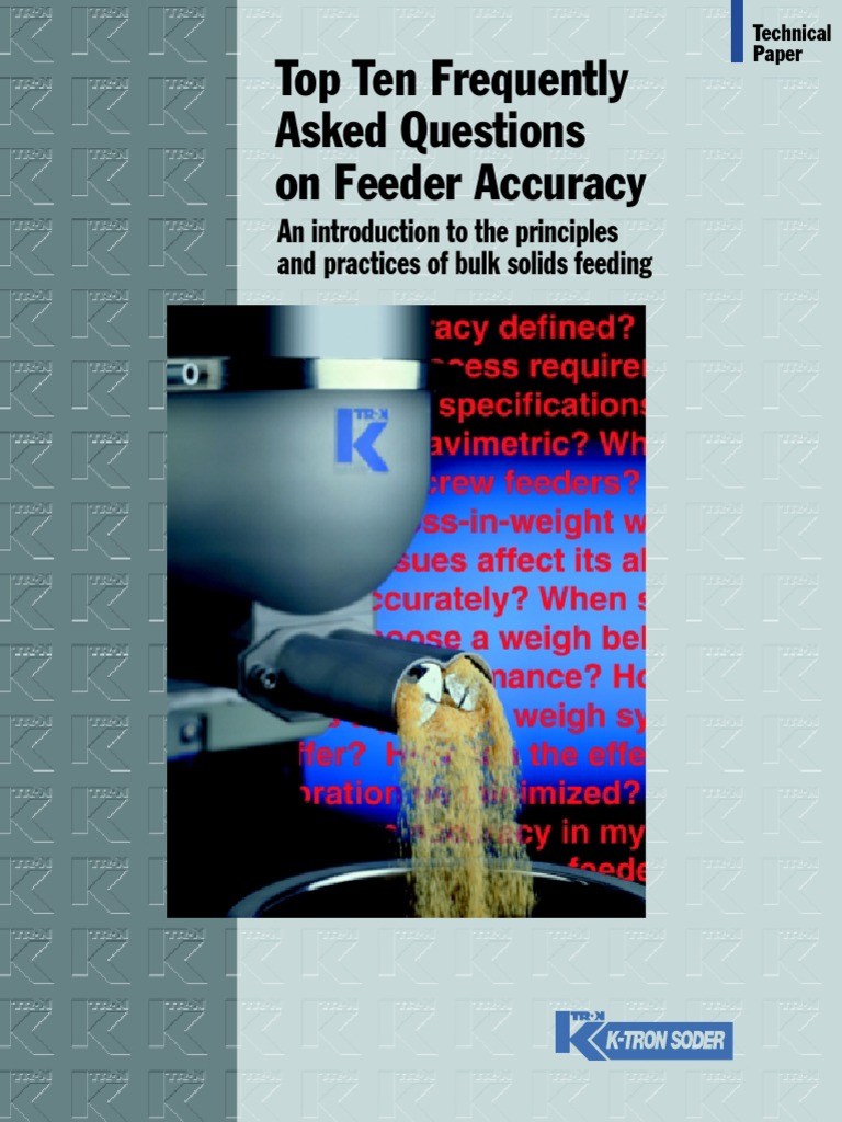 Feeder accuracy is a concern of any processor who has to control the flow of bulk solid material. This handy guide attempts to answer the most common questions surrounding the area of feeder accuracy, and should serve to form a working knowledge of the basics of continuous feeding. While applications can range from the simple regulation of a single material to highly complex and sophisticated, multi-ingredient blending systems involving many feeders and processing lines, this discussion will limit its focus to individual feeder accuracy. By combining a presentation of the principles of feeder accuracy along with the practical aspects of their application to real world process operation, it is hoped a more useful and rounded understanding is achieved.