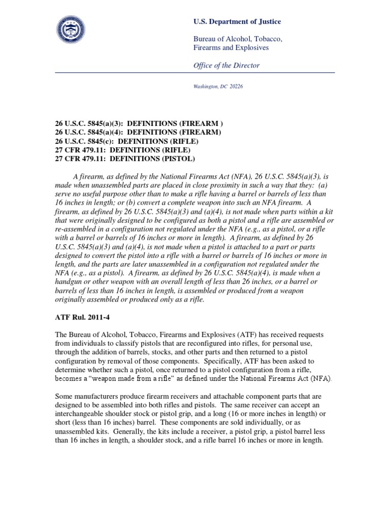 26 U.S.C. 5845(a)(3): DEFINITIONS (FIREARM ) 26 U.S.C. 5845(a)(4): DEFINITIONS (FIREARM) 26 U.S.C. 5845(c): DEFINITIONS (RIFLE) 27 CFR 479.11: DEFINITIONS (RIFLE) 27 CFR 479.11: DEFINITIONS (PISTOL) A firearm, as defined by the National Firearms Act (NFA), 26 U.S.C. 5845(a)(3), is made when unassembled parts are placed in close proximity in such a way that they: (a) serve no useful purpose other than to make a rifle having a barrel or barrels of less than 16 inches in length; or (b) convert a complete weapon into such an NFA firearm. A firearm, as defined by 26 U.S.C. 5845(a)(3) and (a)(4), is not made when parts within a kit that were originally designed to be configured as both a pistol and a rifle are assembled or re-assembled in a configuration not regulated under the NFA (e.g., as a pistol, or a rifle with a barrel or barrels of 16 inches or more in length). A firearm, as defined by 26 U.S.C. 5845(a)(3) and (a)(4), is not made when a pistol is attached to a part or parts designed to convert the pistol into a rifle with a barrel or barrels of 16 inches or more in length, and the parts are later unassembled in a configuration not regulated under the NFA (e.g., as a pistol). A firearm, as defined by 26 U.S.C. 5845(a)(4), is made when a handgun or other weapon with an overall length of less than 26 inches, or a barrel or barrels of less than 16 inches in length, is assembled or produced from a weapon originally assembled or produced only as a rifle. ATF Rul. 2011-4 The Bureau of Alcohol, Tobacco, Firearms and Explosives (ATF) has received requests from individuals to classify pistols that are reconfigured into rifles, for personal use, through the addition of barrels, stocks, and other parts and then returned to a pistol configuration by removal of those components. Specifically, ATF has been asked to determine whether such a pistol, once returned to a pistol configuration from a rifle, becomes a weapon made from a rifle as defined under the National Firearms Act (NFA). Some manufacturers produce firearm receivers and attachable component parts that are designed to be assembled into both rifles and pistols. The same receiver can accept an interchangeable shoulder stock or pistol grip, and a long (16 or more inches in length) or short (less than 16 inches) barrel. These components are sold individually, or as unassembled kits. Generally, the kits include a receiver, a pistol grip, a pistol barrel less than 16 inches in length, a shoulder stock, and a rifle barrel 16 inches or more in length.
