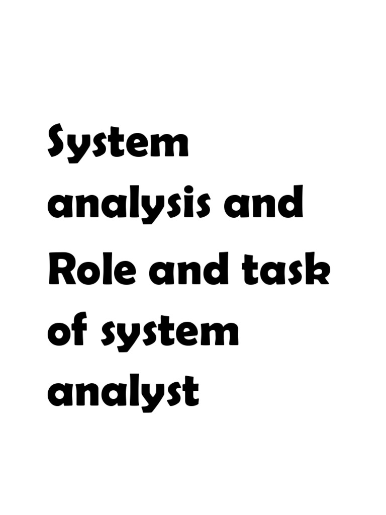 System analysis: Analysing the system implies designing the system such that the system should contain orderly grouped, flexible, dynamic and interdependent component linked together according to the plan to achieve a specific objectives. System analyst: A system analyst is a person who designs a system for change i.e. a system should be flexible. The roles and tasks of system analyst: A system analyst primary responsibility is to identify information needs of an organization & obtain a logical design of information system which will meet this needs. A system analyst have to design a system which should be efficient to 1. Managers 2. Users of the system 3. Computer programmers We can find out the roles and task of information system analyst in the following 8 categories 1. Defining requirement. 2. Prioritizing requirements by consensus. 3. Gathering data, facts and opinions of users. 4. Analysing and evaluation. 5. Solving problems.