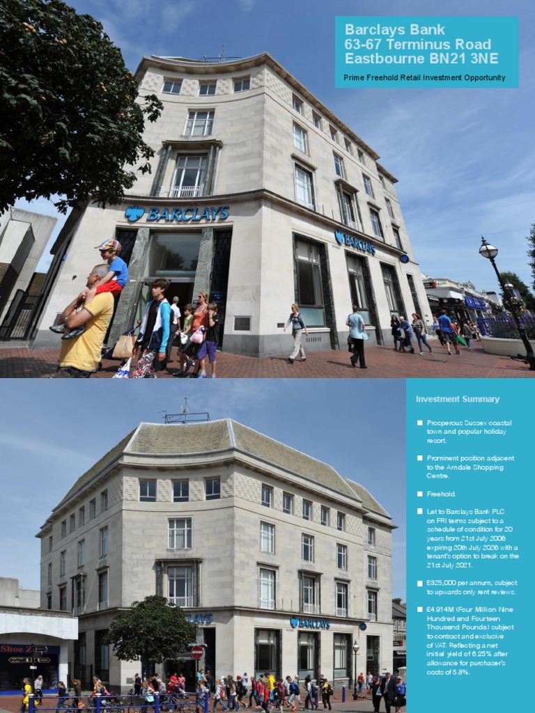 Prosperous Sussex coastal town and popular holiday resort. Prominent position adjacent to the Arndale Shopping Centre. Freehold. Let to Barclays Bank PLC on FRI terms subject to a schedule of condition for 20 years from 21st July 2006 expiring 20th July 2026 with a tenants option to break on the 21st July 2021. 325,000 per annum, subject to upwards only rent reviews. 4.914M (Four Million Nine Hundred and Fourteen Thousand Pounds) subject to contract and exclusive of VAT. Reflecting a net initial yield of 6.25% after allowance for purchasers costs of 5.8%.