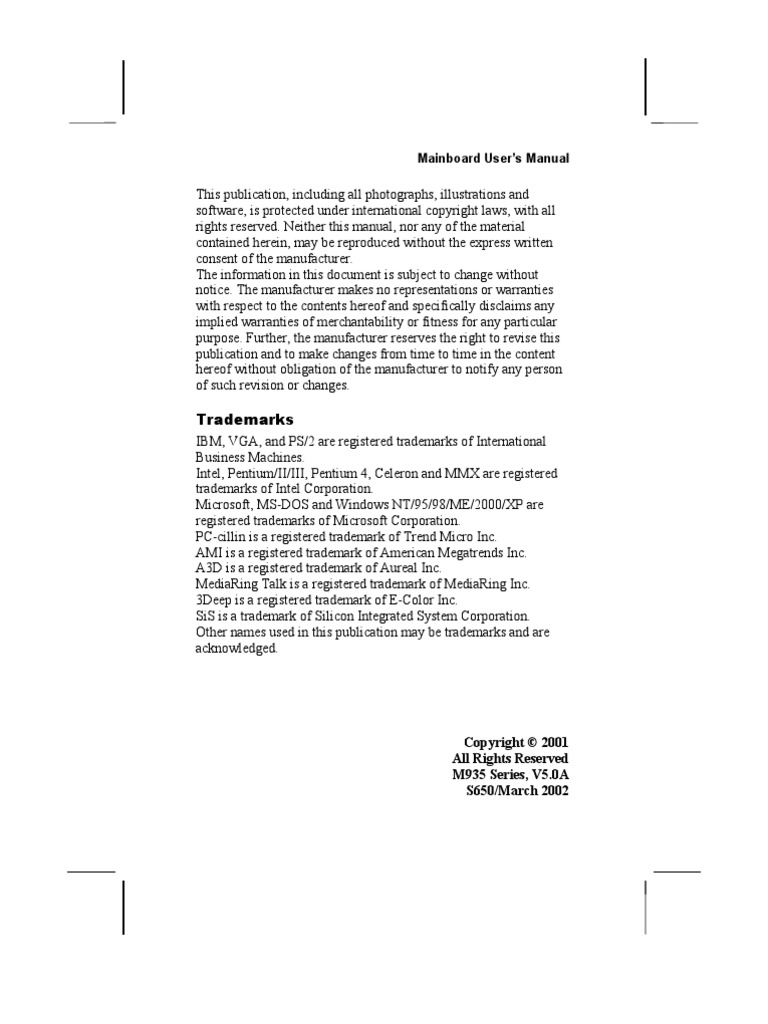 IBM, VGA, and PS/2 are registered trademarks of International Business Machines. Intel, Pentium/II/III, Pentium 4, Celeron and MMX are registered trademarks of Intel Corporation. Microsoft, MS-DOS and Windows NT/95/98/ME/2000/XP are registered trademarks of Microsoft Corporation. PC-cillin is a registered trademark of Trend Micro Inc. AMI is a registered trademark of American Megatrends Inc. A3D is a registered trademark of Aureal Inc. MediaRing Talk is a registered trademark of MediaRing Inc. 3Deep is a registered trademark of E-Color Inc. SiS is a trademark of Silicon Integrated System Corporation. Other names used in this publication may be trademarks and are acknowledged.