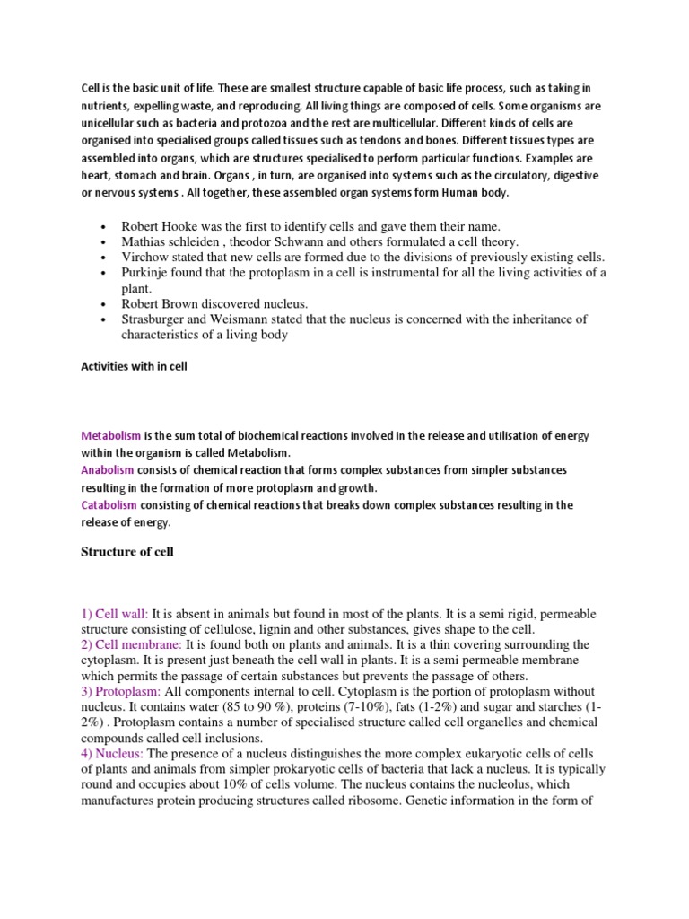 These are smallest structure capable of basic life process, such as taking in nutrients, expelling waste, and reproducing. All living things are composed of cells. Some organisms are unicellular such as bacteria and protozoa and the rest are multicellular. Different kinds of cells are organised into specialised groups called tissues such as tendons and bones. Different tissues types are assembled into organs, which are structures specialised to perform particular functions. Examples are heart, stomach and brain. Organs , in turn, are organised into systems such as the circulatory, digestive or nervous systems . All together, these assembled organ systems form Human body.