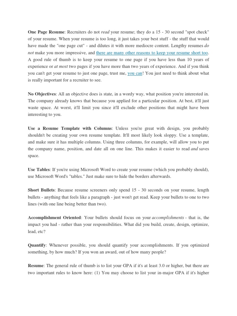 When your resume is too long, it just takes your best stuff - the stuff that would have made the "one page cut" - and dilutes it with more mediocre content. Lengthy resumes do not make you more impressive, and there are many other reasons to keep your resume short too. A good rule of thumb is to keep your resume to one page if you have less than 10 years of experience or at most two pages if you have more than two years of experience. And if you think you can't get your resume to just one page, trust me, you can! You just need to think about what is really important for a recruiter to see. 2 No Objectives: All an objective does is state, in a wordy way, what position you're interested in. The company already knows that because you applied for a particular position. At best, it'll just waste space. At worst, it'll limit you since it'll exclude other positions that might have been interesting to you. 3 Use a Resume Template with Columns: Unless you're great with design, you probably shouldn't be creating your own resume template. It'll most likely look sloppy. Use a template, and make sure it has multiple columns. Using three columns, for example, will allow you to put the company name, position, and date all on one line. This makes it easier to read and saves space. 4 Use Tables: If you're using Microsoft Word to create your resume (which you probably should), use Microsoft Word's "tables." Just make sure to hide the borders afterwards. 5 Short Bullets: Because resume screeners only spend 15 - 30 seconds on your resume, length bullets - anything that feels like a paragraph - just won't get read. Keep your bullets to one to two lines (with one line being better than two). 6 Accomplishment Oriented: Your bullets should focus on your accomplishments - that is, the impact you had - rather than your responsibilities. What did you build, create, design, optimize, lead, etc? 7 Quantify: Whenever possible, you should quantify your accomplishments. If you optimized something, by how much? If you won an award, out of how many people? 8 Resume: The general rule of thumb is to list your GPA if it's at least 3.0 or higher, but there are two important rules to know here: (1) You may choose to list your in-major GPA if it's higher