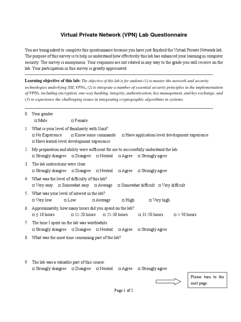 You are being asked to complete this questionnaire because you have just finished the Virtual Private Network lab. The purpose of this survey is to help us understand how effectively this lab has enhanced your learning in computer security. The survey is anonymous. Your responses are not related in any way to the grade you will receive on the lab. Your participation in this survey is greatly appreciated. Learning objective of this lab: The objective of this lab is for students (1) to master the network and security technologies underlying SSL VPNs, (2) to integrate a number of essential security principles in the implementation of VPNs, including encryption, one-way hashing, integrity, authentication, key management, and key exchange, and (3) to experience the challenging issues in integrating cryptographic algorithms in systems. 0. Your gender Male