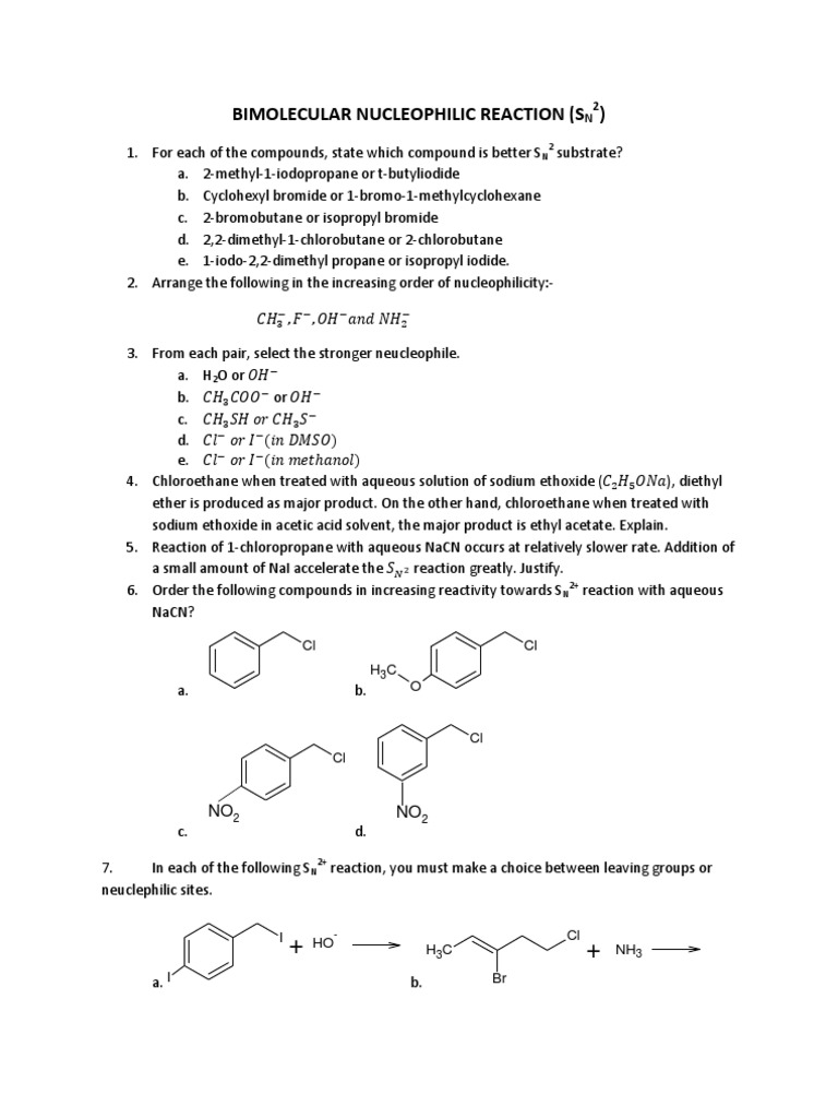 1. For each of the compounds, state which compound is better SN2 substrate? a. 2-methyl-1-iodopropane or t-butyliodide b. Cyclohexyl bromide or 1-bromo-1-methylcyclohexane c. 2-bromobutane or isopropyl bromide d. 2,2-dimethyl-1-chlorobutane or 2-chlorobutane e. 1-iodo-2,2-dimethyl propane or isopropyl iodide. 2. Arrange the following in the increasing order of nucleophilicity:-