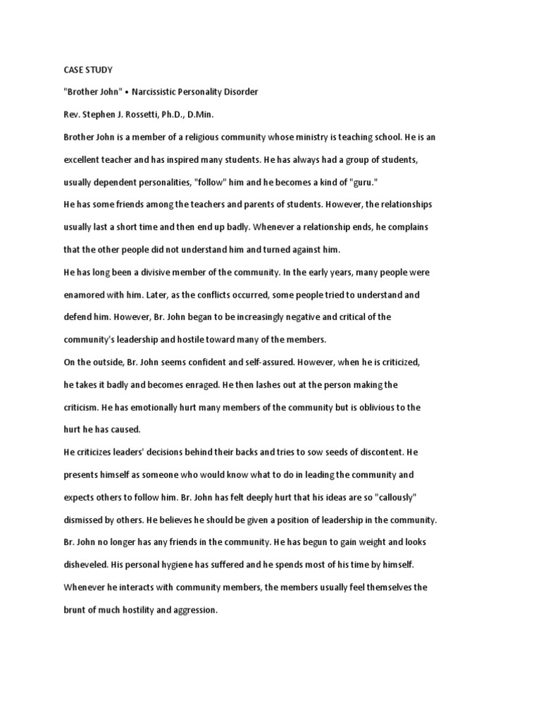 CASE STUDY "Brother John" Narcissistic Personality Disorder Rev. Stephen J. Rossetti, Ph.D., D.Min.