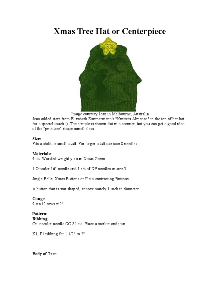 Image courtesy Jean in Melbourne, Australia Jean added stars from Elizabeth Zimmermann's "Knitters Almanac" to the top of her hat for a special touch :). The sample is shown flat in a scanner, but you can get a good idea of the "pine tree" shape nonetheless. Size: Fits a child or small adult. For larger adult use size 8 needles. Materials: 4 oz. Worsted weight yarn in Xmas Green 1 Circular 16" needle and 1 set of DP needles in size 7 Jingle Bells, Xmas Buttons or Plain contrasting Buttons A button that is star shaped, approximately 1 inch in diameter. Gauge: 9 sts/12 rows = 2" Pattern: Ribbing On circular needle CO 84 sts. Place a marker and join. K1, P1 ribbing for 1 1/2" to 2".