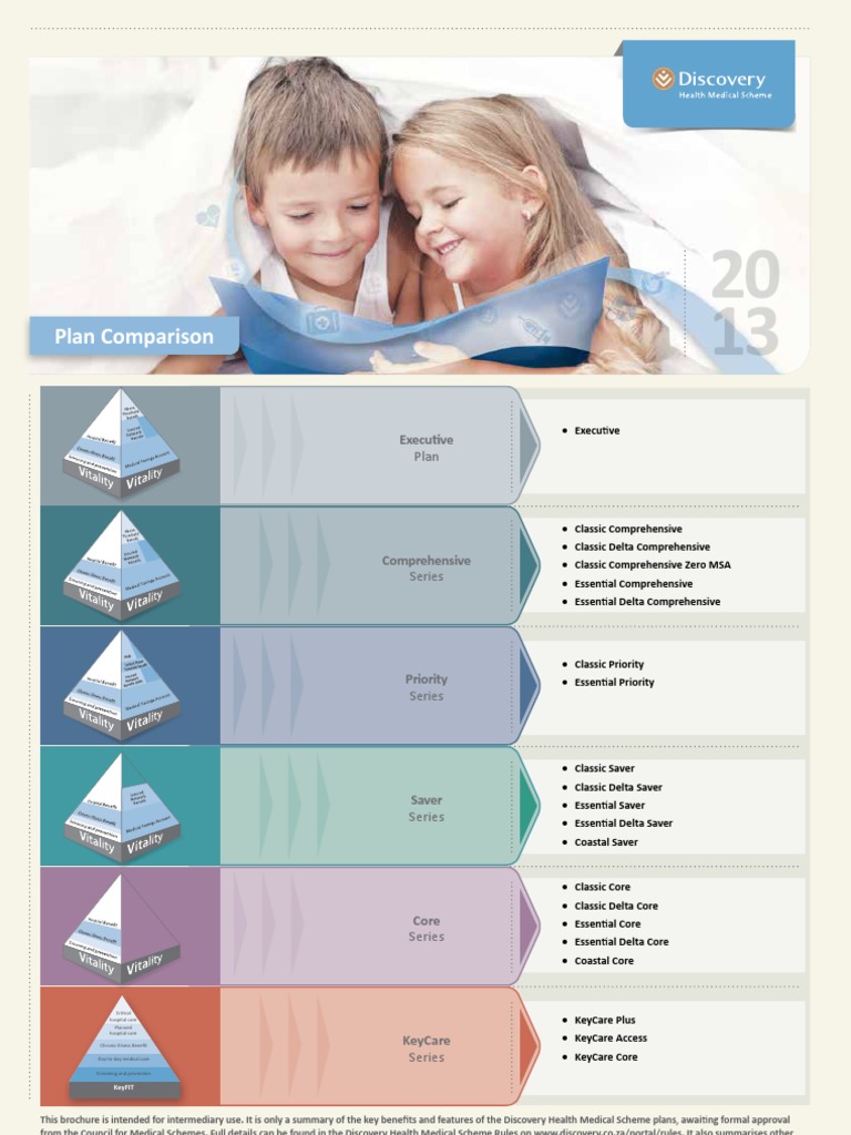 This brochure is intended for intermediary use. It is only a summary of the key benefits and features of the Discovery Health Medical Scheme plans, awaiting formal approval from the Council for Medical Schemes. Full details can be found in the Discovery Health Medical Scheme Rules on www.discovery.co.za/portal/rules. It also summarises other Discovery products and value-added services. For compliance questions, email compliance@discovery.co.za. Discovery Health Medical Scheme, registration number 1125, is administered by Discovery Health (Pty) Ltd, registration number 1997/013480/07, an authorised financial services provider. Vitality is not part of the Discovery Health Medical Scheme. Vitality is a separate product sold and administered by Vitality Healthstyle (Pty) Ltd, registration number 1999/007736/07, an authorised financial services provider.