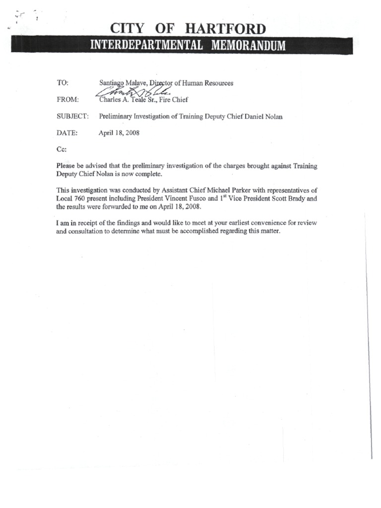 The preliminary investigation of the charges brought against Deputy Chief Nolan is now complete. Deputy Chief Nolan admitted to speaking to eight to ten applicants prior to the Fire Chiefs i…