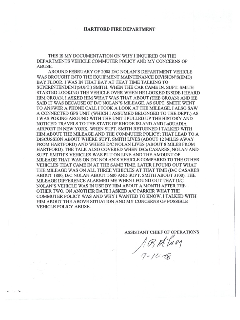 HARTFORD FIRE DEPARTMENT'S VEHICLE WAS BROUGHT INTO THE EQUIPMENT MAINTENANCE DIVISION'S(EMD) BAY FLOOR. SUPT. SMITH STARTED LOOKING THE CAR OVER WHEN HE LOOKED INSIDE I HEARD HIM GROAN. I A…