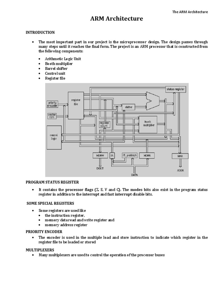 INTRODUCTION The most important part in our project is the microprocessor design. The design passes through many steps until it reaches the final form. The project is an ARM processor that is constructed from the following components: Arithmetic Logic Unit Booth multiplier Barrel shifter Control unit Register file