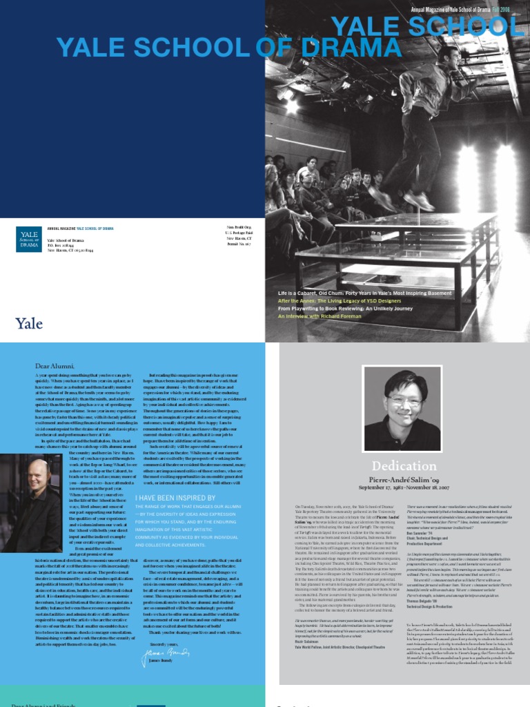 On Tuesday, November 20th, 2007, the Yale School of Drama/ Yale Repertory Theatre community gathered in the University Theatre to mourn the loss and celebrate the life of Pierre-Andr Salim 09, who was killed in a tragic accident on the morning of November 18th during the load-in of Tartuffe. The opening of Tartuffe was delayed for a week to allow for the memorial service. Salim was born and raised in Jakarta, Indonesia. Before coming to Yale, he earned a degree in computer science from the National University of Singapore, where he first discovered the theatre. He remained in Singapore after graduation and worked as a production and stage manager for several theatre companies, including Checkpoint Theatre, Wild Rice, Theatre Practice, and Toy Factory. Salims death devastated communities across two continents, as his colleagues in the United States and in Singapore felt the loss of not only a friend but an artist of great potential. He had planned to return to Singapore after graduating, so that his training could benefit the artists and colleagues to whom he was so committed. Pierre is survived by his parents, his brother and sister, and his maternal grandmother. The following are excerpts from eulogies delivered that day, collected to honor the memory of a beloved artist and friend.
