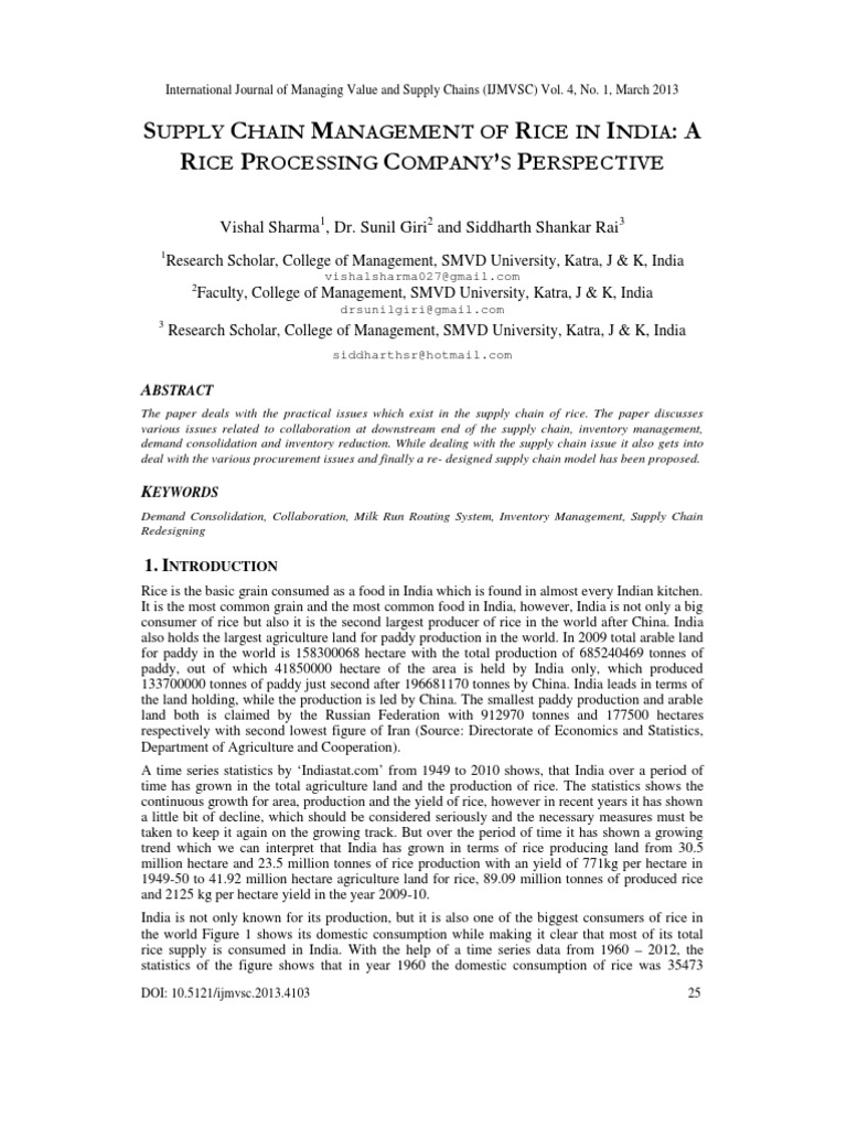The economics of rice in India including production, supply, consumption and yield, along with the agriculture land for paddy farming has continuously shown a growing trend for a period of time, however, with lots of fluctuations and inconsistency. After a growing trend it has shown a declining trend in all these areas in the recent time which is the time of global change. And it can be interpreted as a negative sign if it is about the coping up of the rice industry with changing scenario. Ballabh and Pandey [1] while studying the two villages in India observe the slow agricultural growth of rice as a major issue and emphasise on the new opportunities on increasing the productivity and speeding up the agricultural growth. Shergill [2] find in a study that production of rice in India is questionable on economic and ecological grounds. The decline is the concern of study and it can be either due to the technological obsolescence, the production, distribution, and the issues of market, or all of these issues. All these issues form it as a concern of the supply chain management, which is defined as a philosophy [3] which study the entire flow of material and goods throughout the channel in an integrated way, starting from supplier to the end customer. It is an integration of three or more establishments whose activities are interlinked together directly with a purpose to flow the products, services, finances and information either in upstream or downstream way between the end customer and the source [4]. One can say that for proper functioning of the rice sector in the agriculture industry, and regaining its upward growing trend it is necessary to resolve its supply chain problems, and hence a complete study of the rice supply chain management and its reengineering is essential.