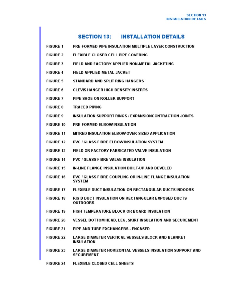 PRE-FORMED PIPE INSULATION MULTIPLE LAYER CONSTRUCTION FLEXIBLE CLOSED CELL PIPE COVERING FIELD AND FACTORY APPLIED NON-METAL JACKETING FIELD APPLIED METAL JACKET STANDARD AND SPLIT RING HANGERS CLEVIS HANGER HIGH DENSITY INSERTS PIPE SHOE ON ROLLER SUPPORT TRACED PIPING INSULATION SUPPORT RINGS / EXPANSIONCONTRACTION JOINTS PRE-FORMED ELBOW INSULATION MITRED INSULATION ELBOW OVER-SIZED APPLICATION PVC / GLASS FIBRE ELBOW INSULATION SYSTEM FIELD OR FACTORY FABRICATED VALVE INSULATION PVC / GLASS FIBRE VALVE INSULATION IN-LINE FLANGE INSULATION BUILT-UP AND BEVELED PVC / GLASS FIBRE COUPLING OR IN-LINE FLANGE INSULATION SYSTEM FLEXIBLE DUCT INSULATION ON RECTANGULAR DUCTS INDOORS RIGID DUCT INSULATION ON RECTANGULAR EXPOSED DUCTS OUTDOORS HIGH TEMPERATURE BLOCK OR BOARD INSULATION VESSEL BOTTOM HEAD, LEG, SKIRT INSULATION AND SECUREMENT PIPE AND TUBE EXCHANGERS - ENCASED LARGE DIAMETER VERTICAL VESSELS BLOCK AND BLANKET INSULATION LARGE DIAMETER HORIZONTAL VESSELS INSULATION SUPPORT AND SECUREMENT FLEXIBLE CLOSED CELL SHEETS