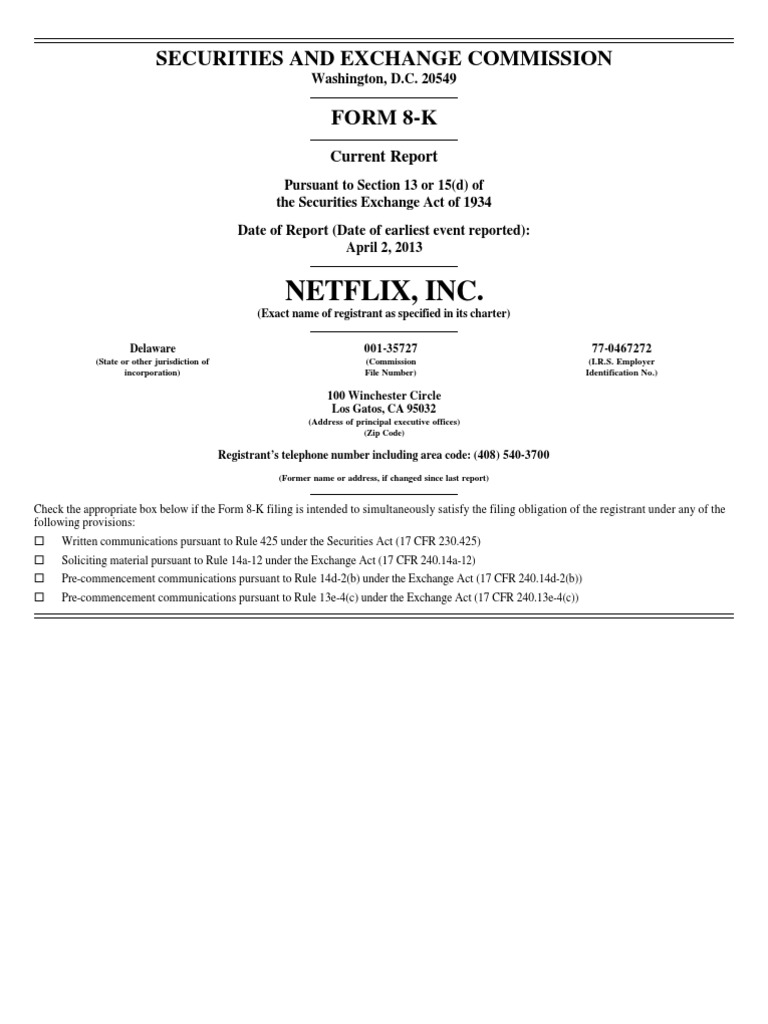 SIGNATURE Pursuant to the requirements of the Securities Exchange Act of 1934, the registrant has duly caused this report to be signed on its behalf by the undersigned hereunto duly authorized. NETFLIX, INC. /s/ David Wells By: David Wells Title: Chief Financial Officer Dated: April 10, 2013