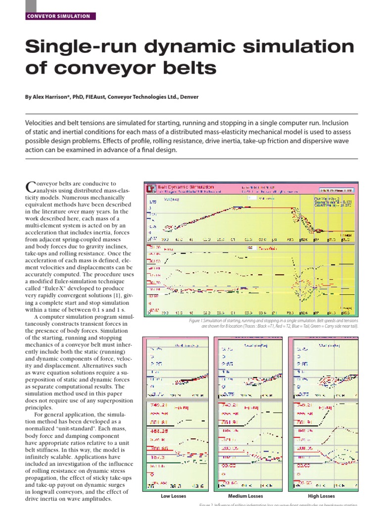 [1] (2008). Non-Linear Belt Transient Analysis. Bulk Solids Handling. Vol. 23, No.4, pp 240 245 (in press) [2] (1992), Modern Belt Take-ups and Their Dynamic Motion. Bulk Solids Handling, Vol. 12., No.4, pp 581-584 (1992) * Alex Harrison. PhD, FIEAust, Formerly Professor in Mechanical Engineering Dept., MERZ/TUNRA Chair of Bulk Handling and Conveying, University of Newcastle, NSW and currently Manager of Conveyor Technologies Ltd. LLC in the USA.