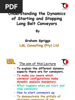 onveyor belts are conducive to analysis using distributed mass-elasticity models. Numerous mechanically equivalent methods have been described in the literature over many years. In the work described here, each mass of a multi-element system is acted on by an acceleration that includes inertia, forces from adjacent spring-coupled masses and body forces due to gravity inclines, take-ups and rolling resistance. Once the acceleration of each mass is defined, element velocities and displacements can be accurately computed. The procedure uses a modified Euler-simulation technique called Euler-X developed to produce very rapidly convergent solutions [1], giving a complete start and stop simulation within a time of between 0.1 s and 1 s. A computer simulation program simultaneously constructs transient forces in the presence of body forces. Simulation of the starting, running and stopping mechanics of a conveyor belt must inherently include both the static (running) and dynamic components of force, velocity and displacement. Alternatives such as wave equation solutions require a superposition of static and dynamic forces as separate computational results. The simulation method used in this paper does not require use of any superposition principles. For general application, the simulation method has been developed as a normalized unit-standard. Each mass, body force and damping component have appropriate ratios relative to a unit belt stiffness. In this way, the model is infinitely scalable. Applications have included an investigation of the influence of rolling resistance on dynamic stress propagation, the effect of sticky take-ups and take-up payout on dynamic surges in longwall conveyors, and the effect of drive inertia on wave amplitudes.