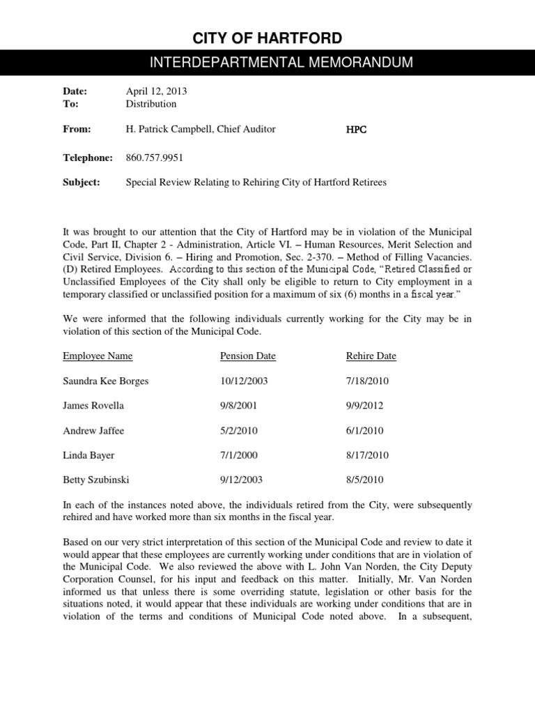 Special Review Relating to Rehiring City of Hartford Retirees It was brought to our attention that the City of Hartford may be in violation of the Municipal Code, Part II, Chapter 2 - Administration, Article VI.