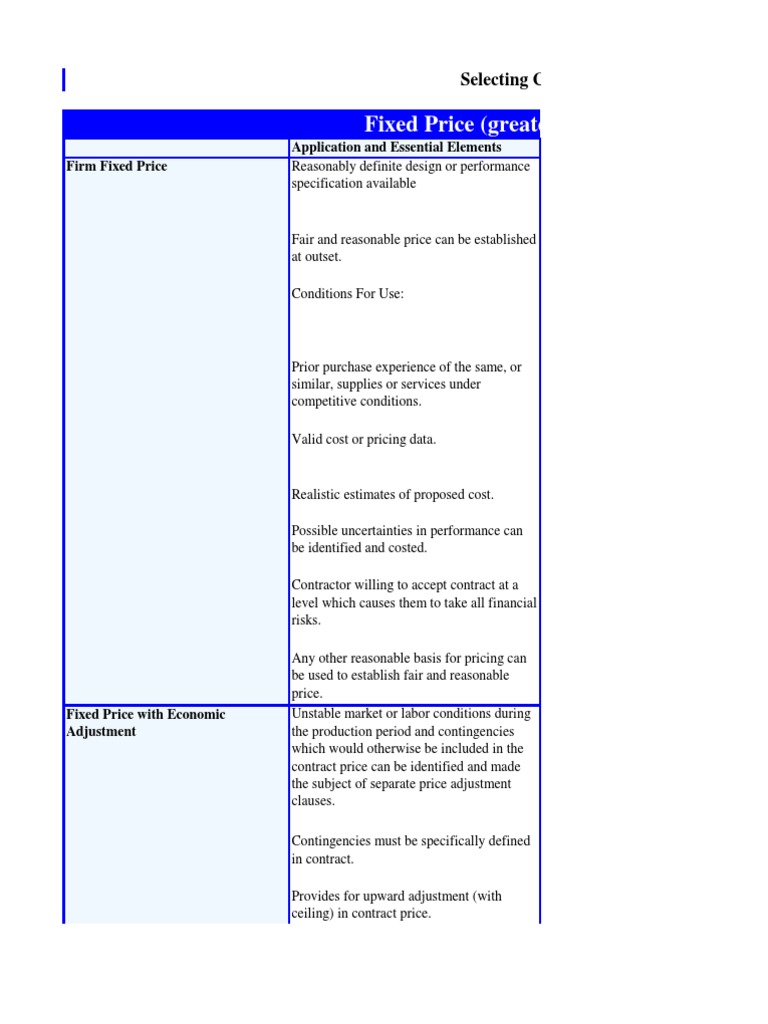 Realistic estimates of proposed cost. Possible uncertainties in performance can be identified and costed. Contractor willing to accept contract at a level which causes them to take all financial risks. Any other reasonable basis for pricing can be used to establish fair and reasonable price. Unstable market or labor conditions during the production period and contingencies which would otherwise be included in the contract price can be identified and made the subject of separate price adjustment clauses. Contingencies must be specifically defined in contract. Provides for upward adjustment (with ceiling) in contract price.