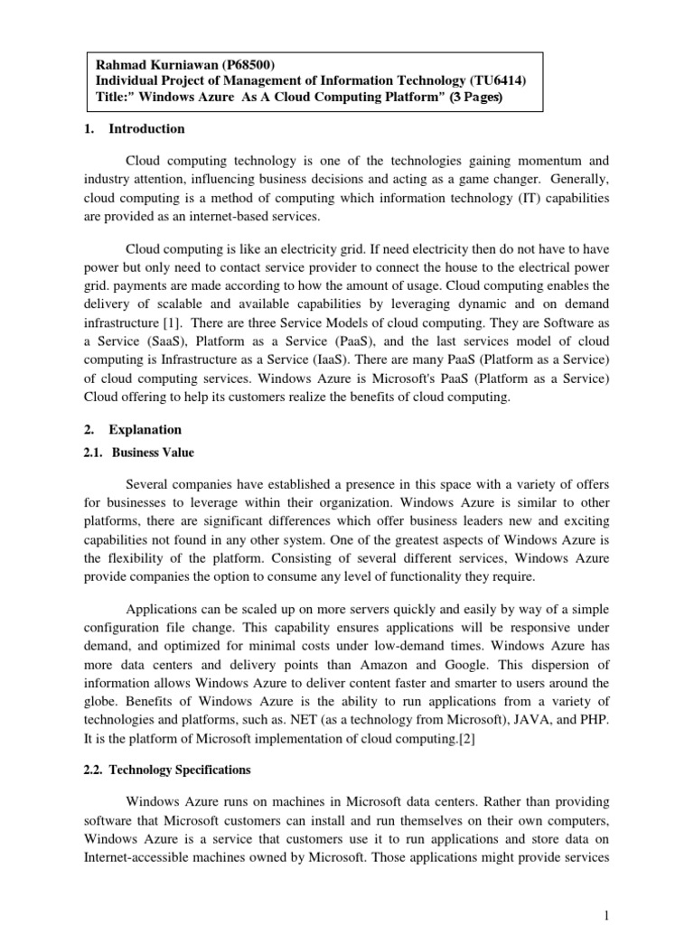 Rahmad Kurniawan (P68500) Individual Project of Management of Information Technology (TU6414) Title: Windows Azure As A Cloud Computing Platform