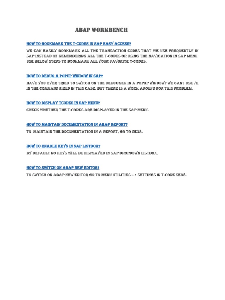 How to bookmark the t-codes in SAP Easy Access? We can easily bookmark all the transaction codes that we use frequently in SAP instead of remembering all the t-codes or using the navigation in SAP menu. Use below steps to bookmark all your favorite t-codes. How to debug a popup window in SAP? Have you ever tried to switch on the debugger in a popup window? We cant use /H in the command field in this case. But there is a work around for this problem. How to Display Tcodes in SAP Menu? Check whether the t-codes are displayed in the SAP menu. How to Maintain Documentation in ABAP Report? To maintain the documentation in a report, go to SE38. How to Enable Keys in SAP Listbox? By default no keys will be displayed in SAP dropdown listbox. How to Switch on ABAP New Editor? To switch on ABAP new editor go to Menu Utilities > Settings in t-code SE38.