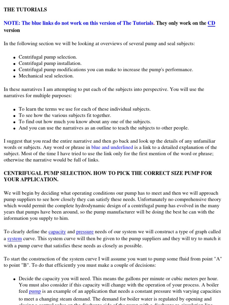 MECHANICAL SEAL SELECTION NOTE: The blue links do not work on this version of the tutorials. . They only work on the CD version In the following pages I will be using the word "pump" to describe the piece of equipment that you will be sealing. If your equipment is anything other than a single stage centrifugal pump with an over hung impeller, the information still applies with a couple of exceptions: